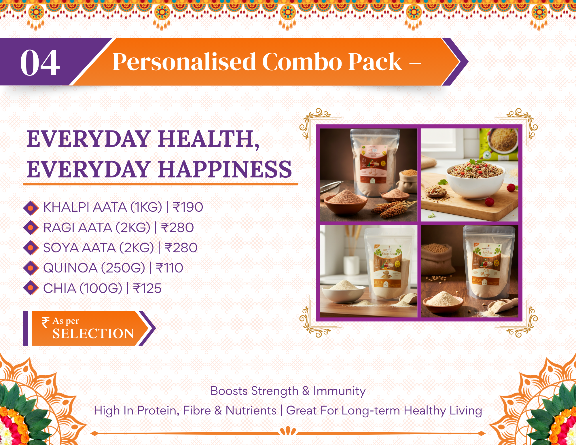 - Whole Millets Goodness: Millet-based snacks and ladoos rich in fibre and nutrients.